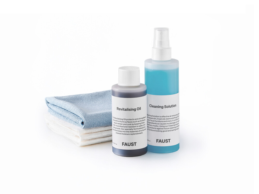 Faust furniture is characterised by beautifully natural and hard wearing surfaces. Our linoleum and wood veneer, like all natural materials, can age and alter over time. You can do much to extend the lifespan of your product and help maintain its qualities by taking care of it. To make this simple for our customers, Faust has created a CARE Kit.