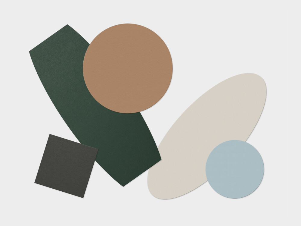 Stacked linoleum table tops from Faust in the colors Brick, Vapour, Mauve, Taupe with different corner radii.
