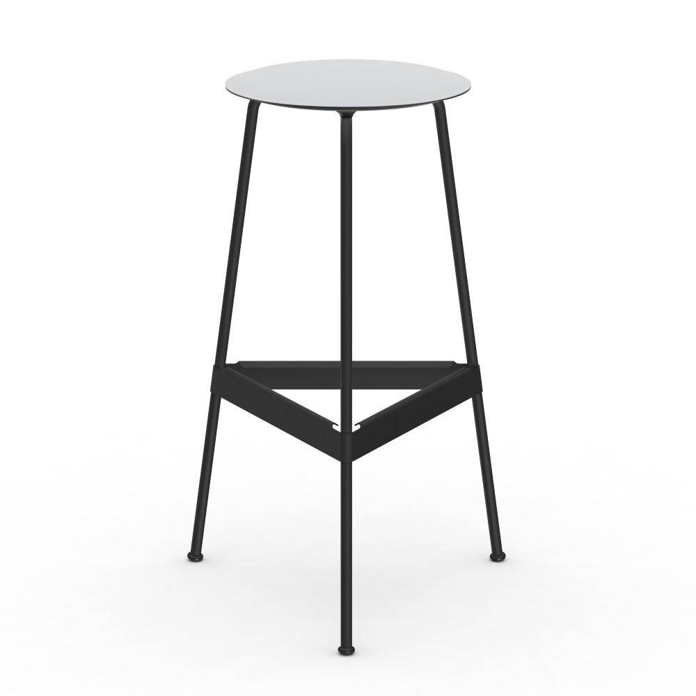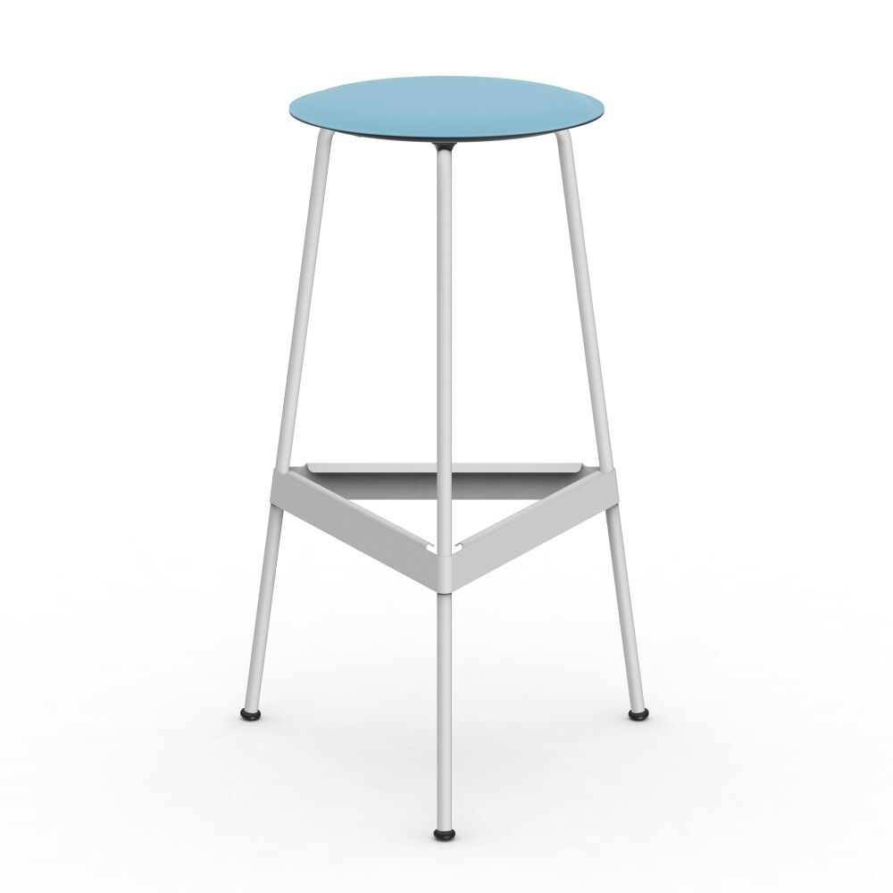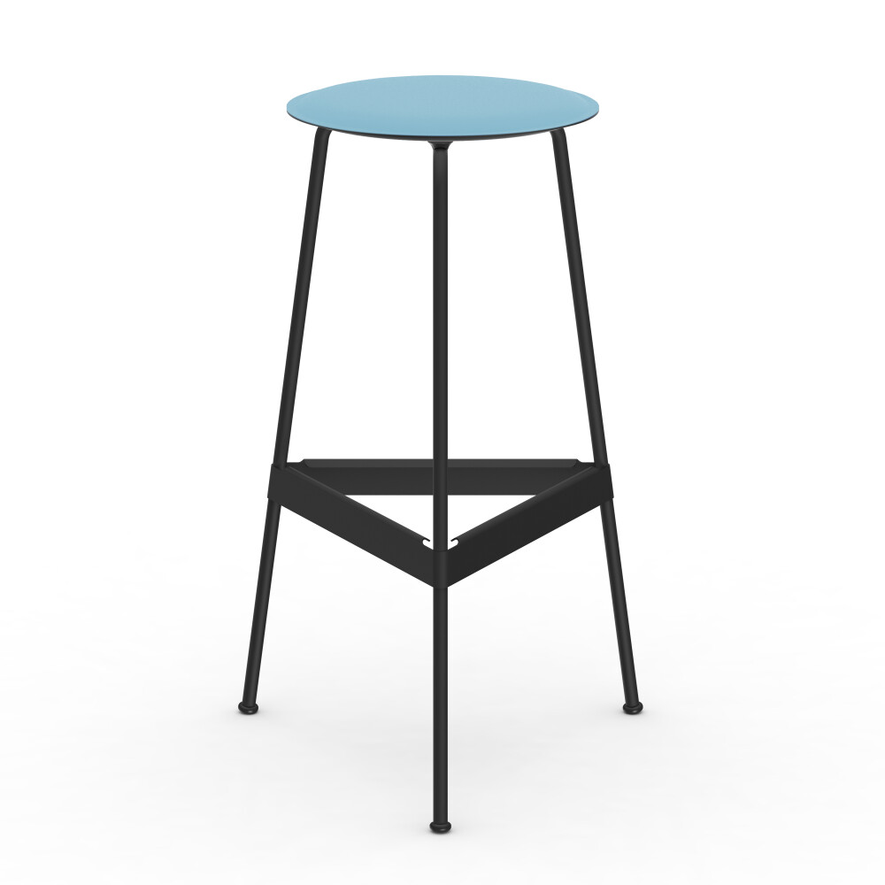 BEAM high table with blue linoleum tabletop, combined with a RAVIOLI bar stool with black seat.