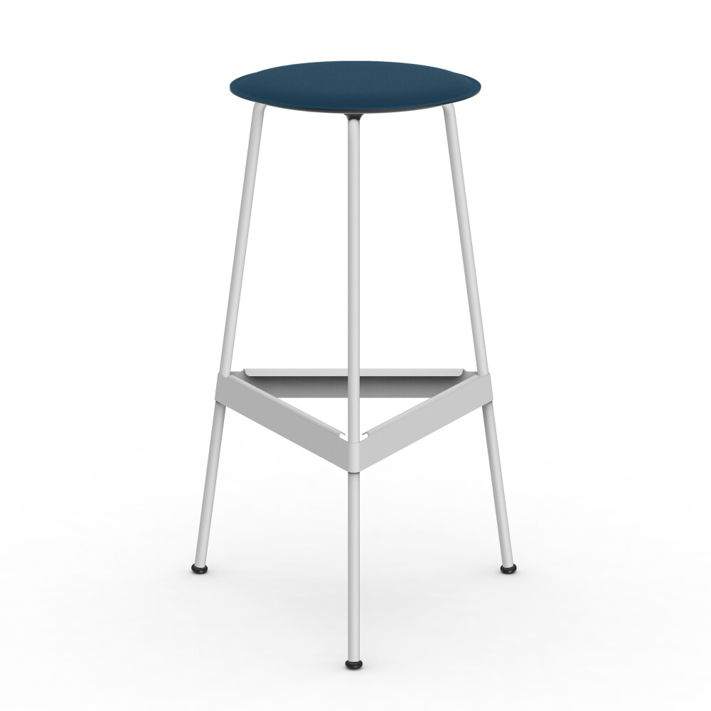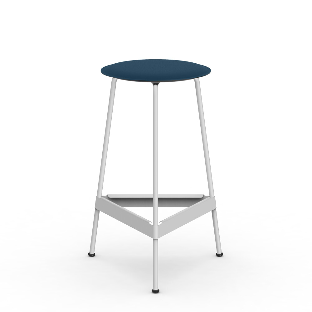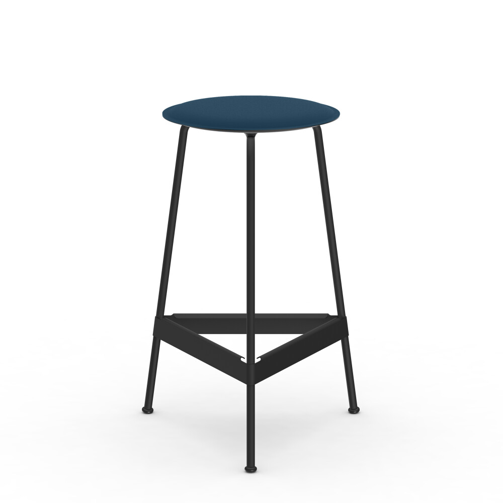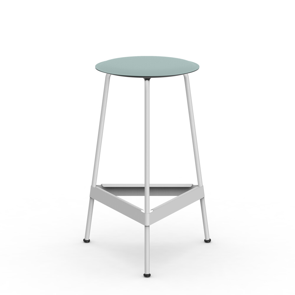 BEAM high table with blue linoleum tabletop, combined with a RAVIOLI bar stool with black seat.