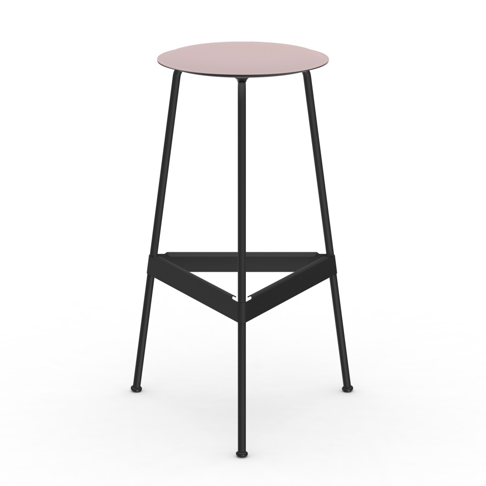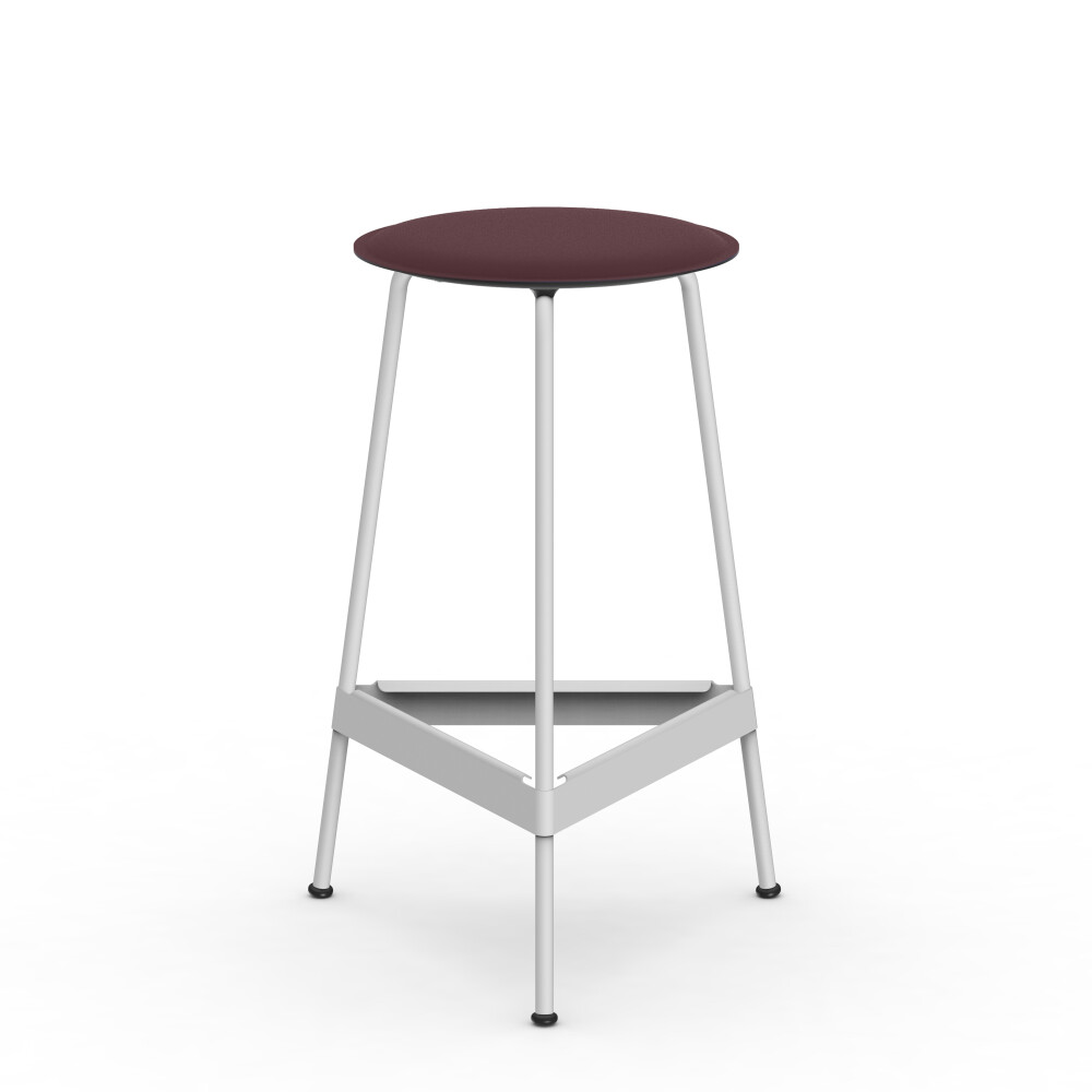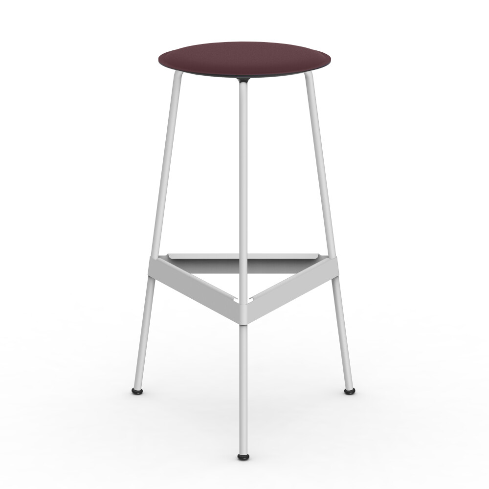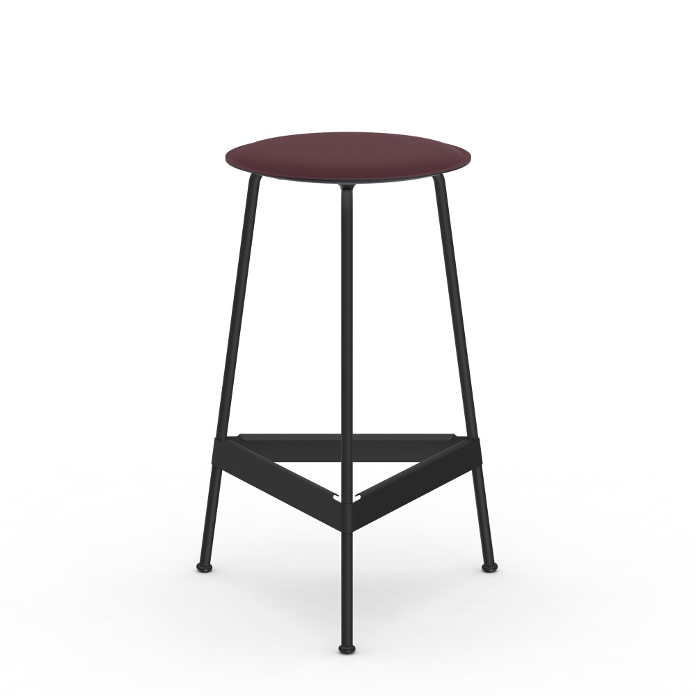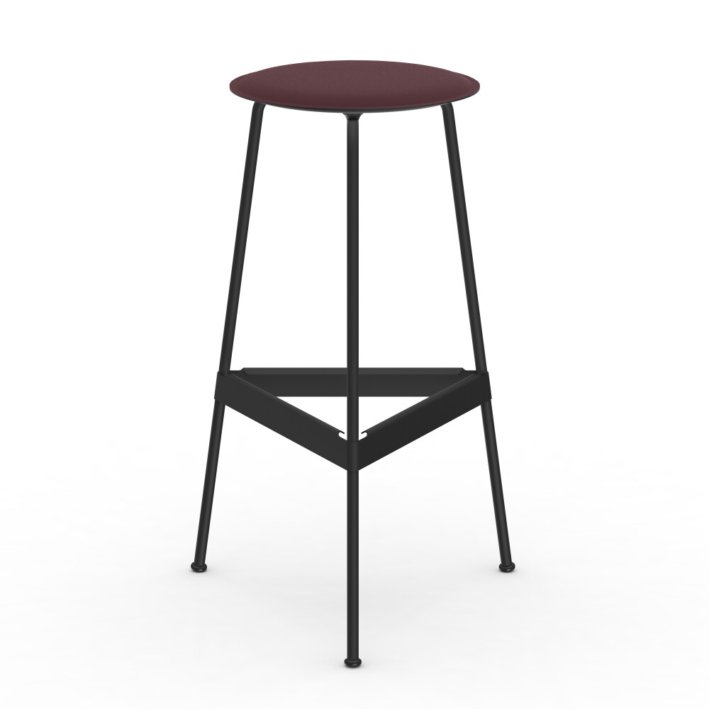 Close-up of the RAVIOLI stool with burgundy linoleum seat and black steel legs.