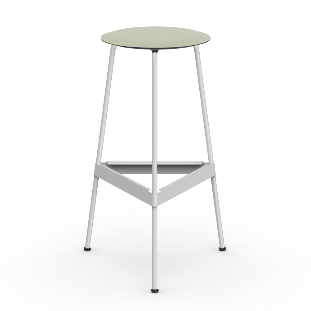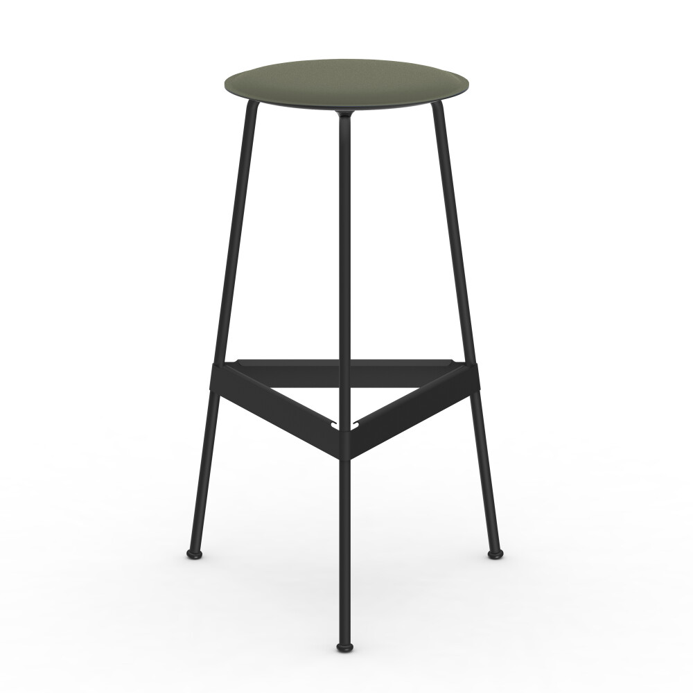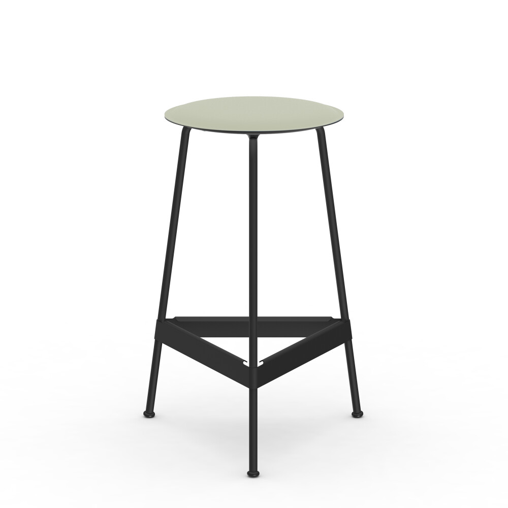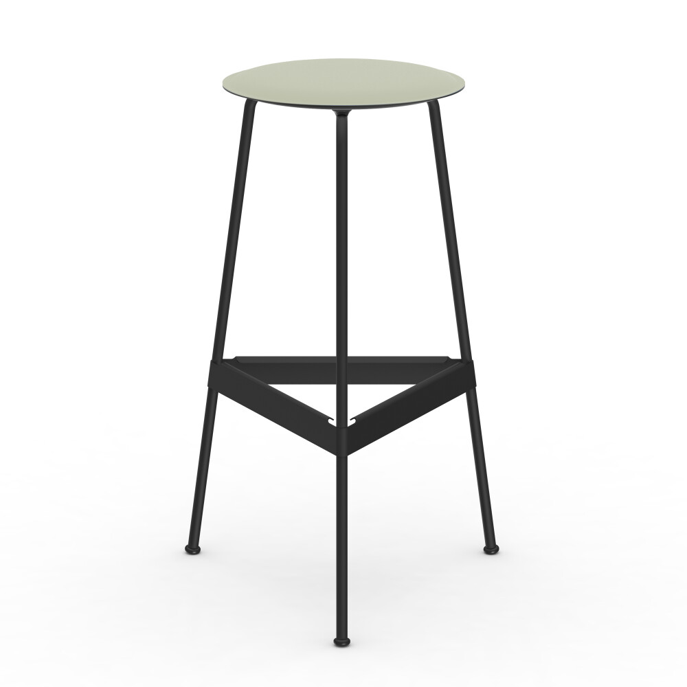 RAVIOLI bar stool with linoleum seat in pistachio and black steel frame, photographed in front of a neutral background in the studio.