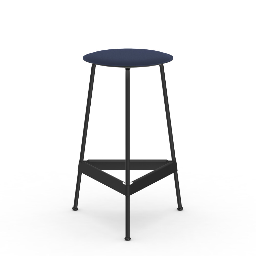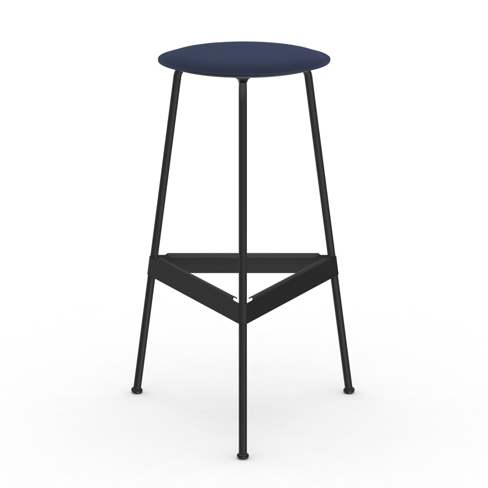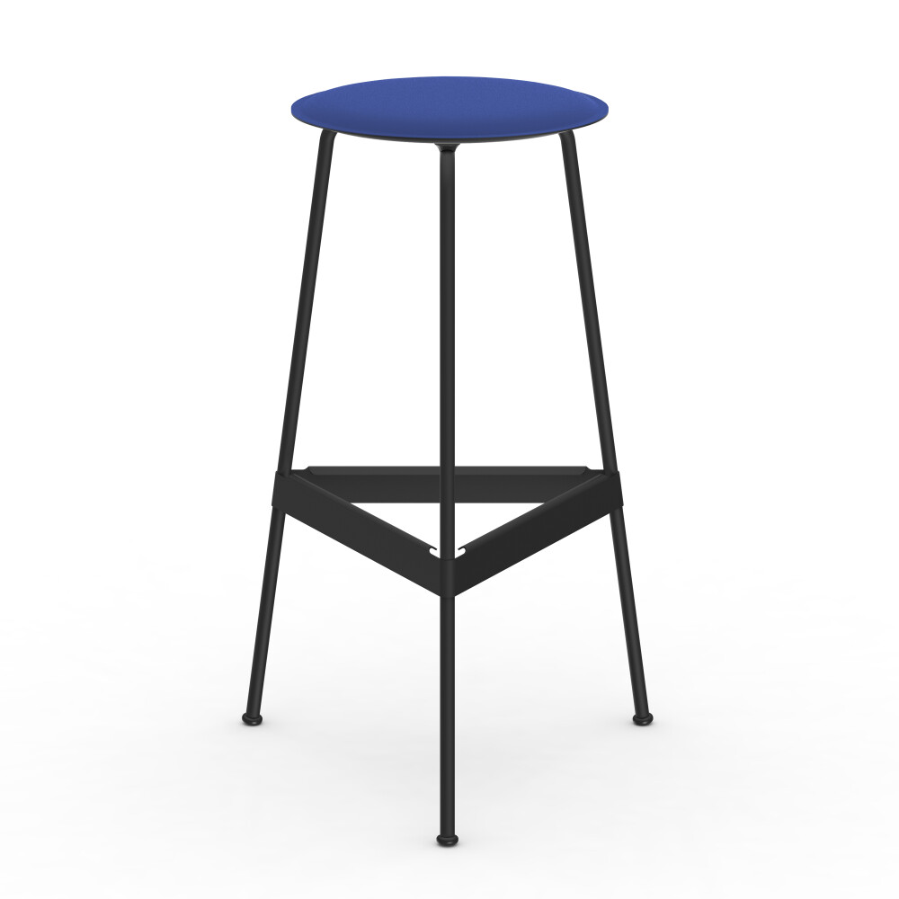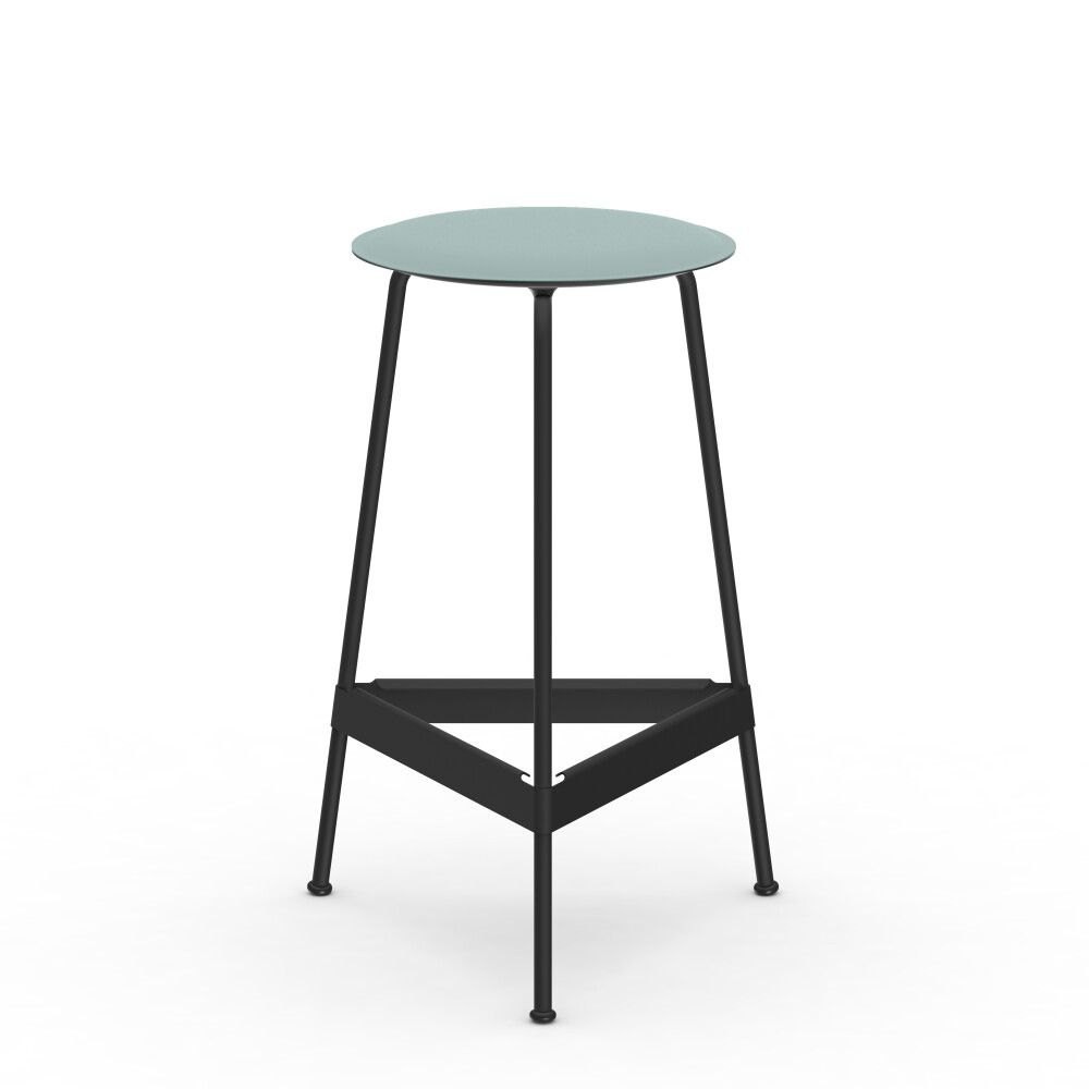 RAVIOLI bar stool with linoleum seat in smokey blue and black steel frame, photographed against a neutral background in the studio.